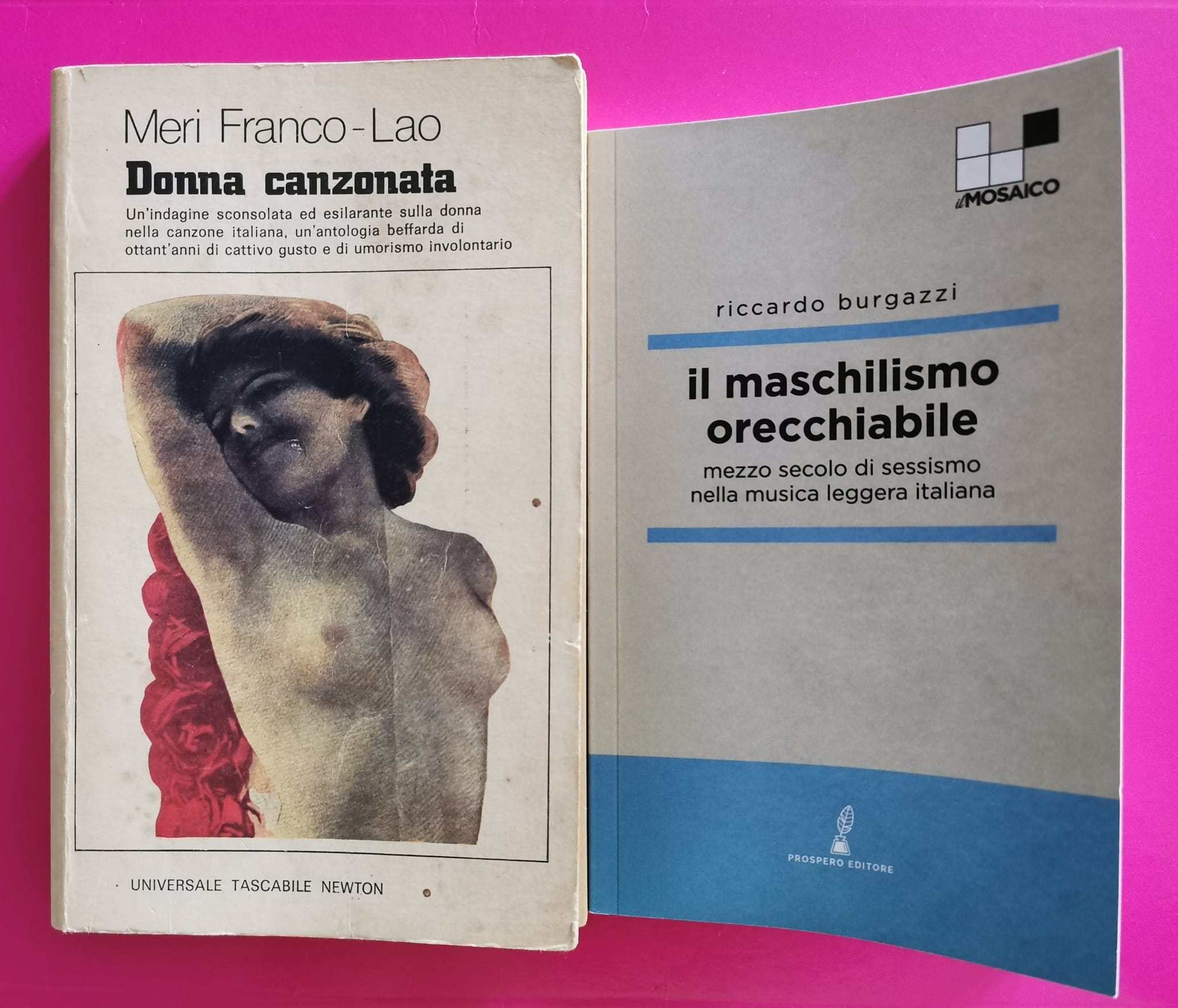 Mi sono quindi messa a pensare alla rappresentazione della donna nella canzone italiana. Sempre grazie alle mie ricerche su Google, mi sono imbattuta in due libri: “Donna Canzonata” di Meri Franco-Lao e “Maschilismo Orecchiabile” di Riccardo Burgazzi.